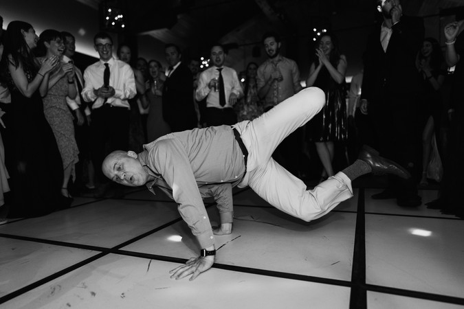 Choreographed First Dance, toasts that roasted our bride and groom in the funniest way, ice cream instead of cake, and breakdancing. Their goal was to throw a wedding and reception party that represented how they live their lives: fun and full of adventure! Each of their table settings was dedicated to a place they had traveled to together. The Nordic Center represented their love of skiing, and in fact, that's how he proposed. They skied out of a helicopter and then he pulled out a ring on the slopes!